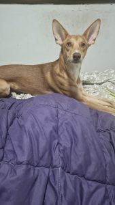Es de tamaño mediana (no es grande), cruce de podenco con lobo herreño, una combinacion única que la hace aún mas especial